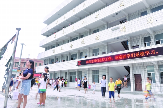 图①:8月29日,永顺县8万余名学生迎来秋季开学报名第一天。图为州民族实验小学里,学生家长在查看学生的分班就读情况,准备报到注册。 张灵峰 摄