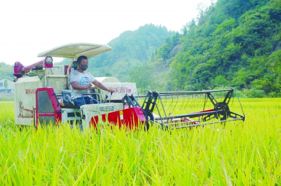 8月27日,永顺县灵溪镇树木村,村民正在忙着收割稻谷。今年7月—8月,面对强降雨和高温干旱袭击,该县及时发布预警信息,相继启动防汛、抗旱应急响应措施,在大家积极科学应对下,该县粮食生产取得了大丰收。 吴 华 摄