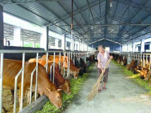 古丈县断龙山镇墨塔村村主任田秀芝,筹集资金500多万元创建了至朴养牛有限责任公司,现存栏湘西黄牛400余头。致富不忘乡亲,村里有10余户贫困户在她的直接帮助下走向了脱贫致富的道路。图为至朴公司工人在打扫牛栏。
