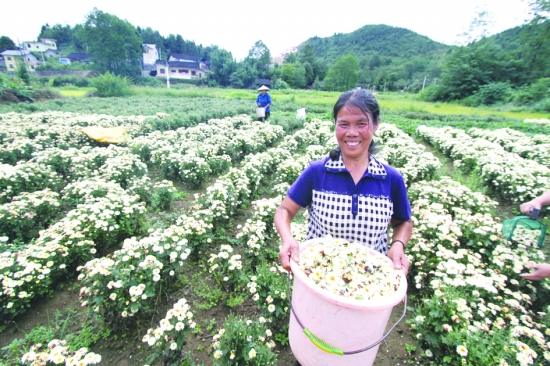9月7日,花垣县长乐乡长潭村,村民在采收黄白菊。今年,该乡引导农民因地制宜种植黄白菊、百合等药材1000余亩。目前,黄白菊花喜获丰收,平均亩产菊花1000公斤左右,每亩可增加收入5000余元。 龙恩泽 龙银慧 摄