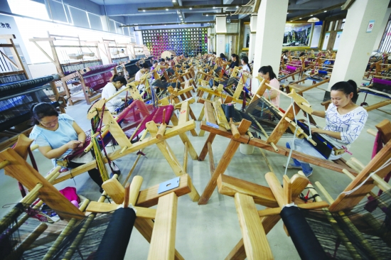 学习织锦技艺 提升就业能力 9月11日,在湖南省张家界市武陵源区乖幺妹土家织锦基地,学员们在学习织锦技艺。 近年来,湖南张家界市武陵源区针对农村留守妇女定期举办土家织锦技能培训班,提升留守妇女的就业和创业能力。目前,全区累计有1200多名农村妇女通过系统培训,掌握了土家织锦技艺,她们通过入股合作社或个人自办加工作坊等方式,利用农闲时间编