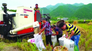 9月7日,在泸溪县浦市镇现代农业示范长廊优质佤乡米种植基地,村民们正忙着将稻谷装袋,个个脸上洋溢着丰收的喜悦。县农业局工作人员以1平方米的标准随机抽样,通过测水分、样本称重,佤乡米稻平均亩产600公斤,最高突破650公斤。 唐正海 摄