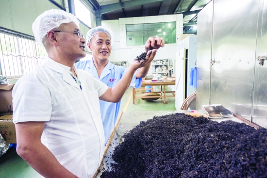 龙自刚(左一)和制茶师田建春一起研究茶叶。田建春曾获得2016年全国“五一”劳动奖章。