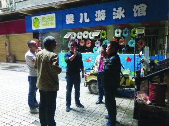 沱江镇三王阁社区工作人员到第七网格美食街一门面现场调解。