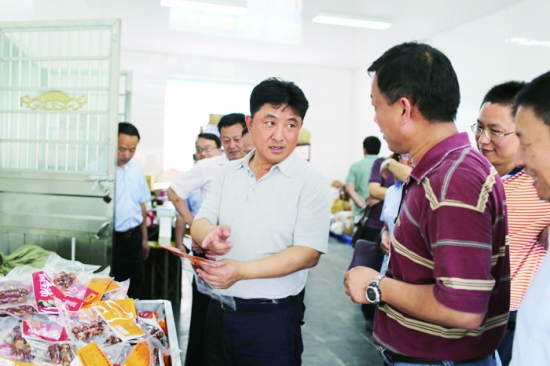 湖南省农信联社主任李勤深入湘西调研金融精准扶贫。图为李勤在湖南鑫科牧业腊制品生产基地调研。