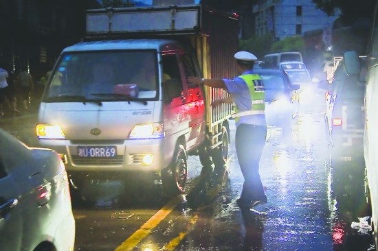 防汛期间,公安交警正在疏导交通秩序。