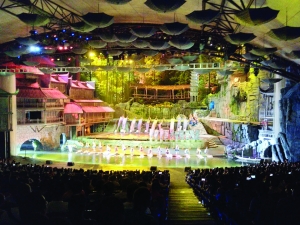 9月19日晚9点参加州庆的中央、省、州等各级嘉宾冒雨在凤凰县观看了独具民族特色的大型森林实景剧《边城》。