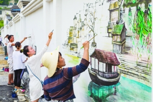 9月14日,湘西经开区民族文化园内,工作人员正在文化墙上作画。为进一步美化园区环境,迎接建州60周年庆的到来,经开区组织人员在园区道路、公园广场等制作文化墙,将湘西风光、民俗节日等为题材的画作为园区的点缀,生动地展现湘西的民族特色,成为园区一道靓丽风景。 张术杰 刘 博 摄