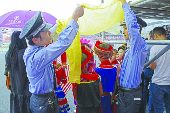 安保人员用雨衣为小演员们遮雨