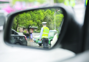 9月20日,一辆汽车后视镜中正在执勤的交警的背影。当天,州庆大会散会后,这名交警在209国道吉首乾州汽车总站路段疏导交通。州庆期间,我州投入450余名警力上路执勤,保障了道路交通安全。