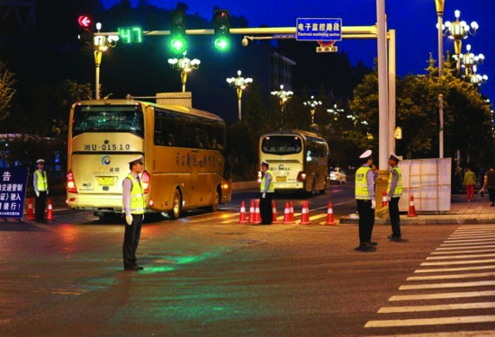 夜幕下,交警在路上指挥过往车辆。 贾绍安 摄