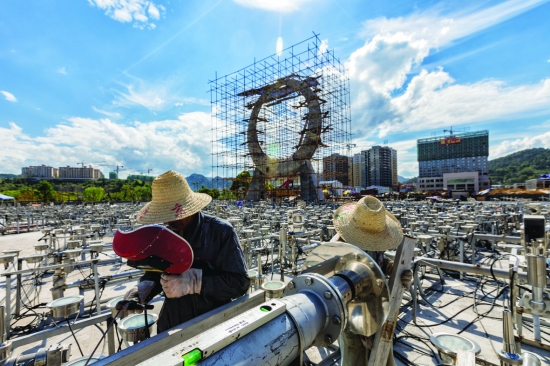 8月18日,经开区音乐喷泉水秀项目工地内,工人在进行作业。 刘振军 张术杰 摄