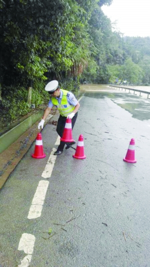 9月28日,吉首市交警正在放置警示锥筒。9月27日,吉首地区突降大雨 ,导致319国道寨阳路段多处积水,坪朗路段由于积水较深车辆已经无法通行 。该市交警三中队民警一大早就赶到积水路段 ,竖起警示标志, 引导车辆分流 ,并积极联系媒体发布路况信息。 石志文 摄