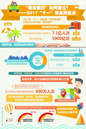 观展览、赏民俗、看演出、自驾游等成为众多民众青睐的度假方式。截至10月7日,“砥砺奋进的五年”大型成就展累计参观人数突破30万人次,各地群众在此感受五年来国家各项事业取得的伟大成就。红色游、自驾游、郊区游备受青睐,四川红色景区前5天累计接待游客104.4万人次,湖北、湖南等地自驾自助游占比超过了80%。