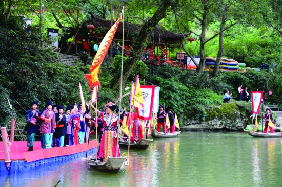 10月1日,国庆长假,永顺县老司城景区在司城灵溪河畔搭建了水上舞台,该县土家族艺术团用激情演绎舞剧《土王出征》,向游客们展示土家人当年的爱国豪情,民族壮歌,来提升景区品位。 刘文化 摄