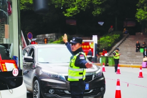 10月6日,凤凰县南华路段交警在指挥车辆、游客通行。国庆中秋“双节”长假,来往凤凰县的自驾游车辆、游客比往年明显增多,为确保车流畅通和游客、市民安全出行,该县增派大批民警在车流、人流密集的路段和人车出入相对集中的时间段加强交通疏导,提供便民服务。