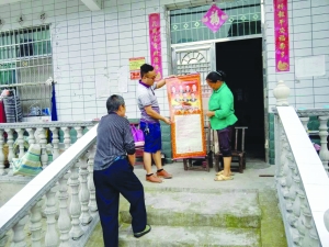 10月9日,永顺县永茂镇卓福村,驻村干部正在上门入户发放印有村规民约的挂历。卓福村是该县美丽乡村建设的示范村,该村创新和丰富宣传载体,自费5000多元精心定制了一批印有美丽乡村建设相关内容的挂历免费赠送给村民,受到了群众的一致好评。