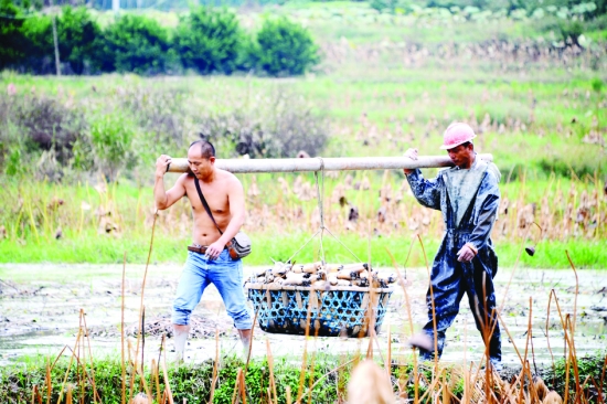 彭英涵与取藕师傅在运藕。