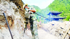 9月27日,在永顺县老司城周家湾的摆手堂边,一施工人员在打风钻,平整地基,准备着手修建观影长廊。今年7月,该县旅文局投入150多万元资金,在摆手堂新建“观影长廊”,以提升司城文化演艺品位。