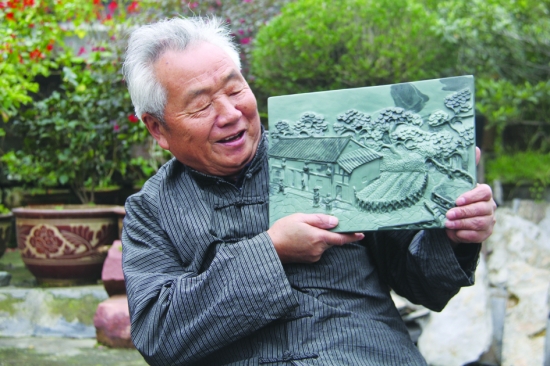 龙正贤展示雕刻作品《圆梦》。 龙正贤与作品《精准扶贫树》。 杨 木 摄