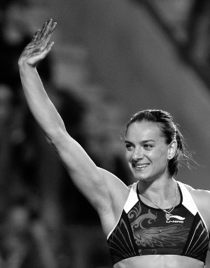 9月4日,俄罗斯选手伊辛巴耶娃在比赛中向观众致意。当日,在2009年国际田联黄金联赛最后一站———布鲁塞尔站比赛中,伊辛巴耶娃、贝克勒和理查兹分别获得女子撑杆跳高、男子5000米和女子400米冠军,六站全胜,分享百万黄金大奖。 新华社/路透