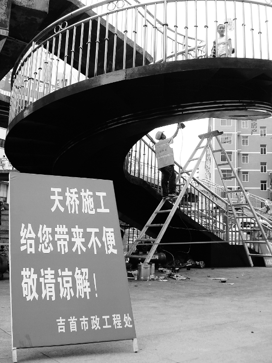 为迎接即将到来的国庆与中秋佳节,吉首市对人民路天桥进行修整和重新上漆。图为9月17日施工现场。 彭 宁 摄