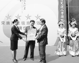 9月23日,天下凤凰大酒店荣膺四星级旅游饭店授牌仪式在凤凰举行,天下凤凰大酒店共有559间高档客房,是我州第二家四星级旅游饭店,将为凤凰旅游发展增速提质产生长远影响。图为湖南省旅游局副局长刘之明(左三)为天下凤凰大酒店负责人授牌。