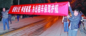 11月11日20时许,吉首市汽车西站附近,数百名司机、群众打着横幅迎接破案民警归来。11月7日,随着犯罪嫌疑人张磊在四川省自贡市被捕,吉首市“9·15”杀害女出租车司机命案成功告破。 通讯员 马思动 摄