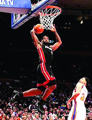 12月18日,热火队员韦德在比赛中跃身扣篮。当日,热火客场113比91大胜尼克斯,取得11连胜。詹姆斯砍下32分、11篮板、10助攻,韦德26分8板,波什26分7板。