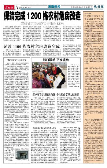 本报讯(记者 欧阳仕君)今年9月,泸溪县启动农村危房改造工作,解决农村困难群众基本居住安全问题,实现村民住有所居的目标,截至目前,全县1100栋农村危房改造任务基本完成。 今年,该县根据本地实际和建房户困难程度,确定分类补助标准,原则上新建房屋补助资金1万元,维修房屋补助标准根据房屋破损程度实施分档补助。并按照“因地制宜、合理布局、形式多样、防灾减灾、节约土地、城乡一体”的原则,实施农村危房改造工作。将因灾倒房户和农村无房户、低保户、贫困残疾人、火灾户及其他农村贫困户作为改造补助的重点对象。 据悉,春节前,该县所有的危改户都可以住进新居。 |