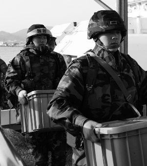 12月18日,在韩国延坪岛港口,韩国海军陆战队员搬运物资。