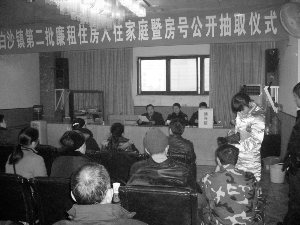 12月25日上午,泸溪县建设职能部门和公证处为白沙镇廉租房申请人举办抽签入住活动。期间共有66户申请人分到了廉租房。据了解,到12月26日,该县还将通过抽签方式在武溪镇为301户申请人分配301套廉租房。