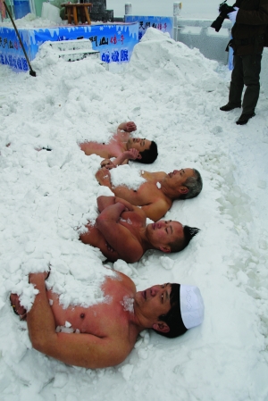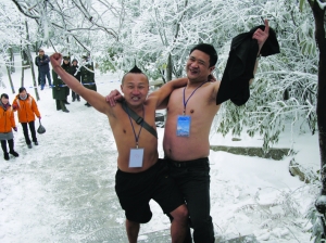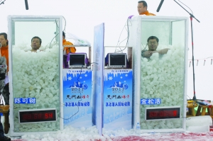 特约记者 覃遵奎 通讯员 丁云娟 1月3日,记者一行应邀来到零下10度、冰雕银装的张家界天门山上,亲眼目睹了一项新的世界纪录的传奇诞生。56岁的黑龙江佳木斯人金松浩,裸身站在贴体填满冰块的冰柜里坚持了120分钟,创造了世界第一“冰人”的新纪录。与他同台挑战寒冰的黑龙江牡丹江人陈可财同样坚持了118分钟。两人先后打破了荷兰人霍夫在香港创造的115分钟的挑战寒冰纪录,获得了由天门山景区授予的“天门山传奇英雄”的称号。 当天下午1时许,“冰冻活人”挑战赛在天门山云梦仙顶正式开始。陈可财先走进冰柜,工作人员一桶接着一桶地将冰块倒入冰柜,直到填没至陈可财的颈部。14分钟后,金松浩进入另一个冰柜。曾在冰柜中创造108分21秒纪录的陈可财因水土不服发生腹泻,早晨和中午都没吃东西,只吃了一点巧克力就进行挑战赛。到37分钟时,陈可财身体严重颤抖,他仍然用顽强的意志坚持着。90分钟时,陈可财腰部疼痛,体温下降到35度,医生建议他终止比赛,但他坚决坚持,直至118分钟,打破了之前荷兰人霍夫的115分钟的纪录。金松浩神情轻松若无其事,不断向观众招手微笑,还请工作人员提供纸笔,写下“天门山传奇”、“我爱张家界”等字样。他坚持了120分钟,挑战成功了,打破了陈可财刚刚创造的世界纪录,成为世界第一“冰人”。 主办单位面向社会招募民间耐寒勇士20名,获选者在直播现场参与耐寒大比拼。参赛者只穿一条短裤,女性选手只穿泳装,依次轮番走进特制的冰屋比赛。 1月4日,四名民间耐寒勇士在天门山云梦仙顶,向冰冻严寒发起了挑战。四名民间耐寒勇士只穿一条短裤,将全身掩埋在雪里,坚持到最后的人方可取胜。10时50分,挑战赛正式开始。11分31秒后,来自浏阳的卜军第一个从雪堆里站了出来。21分26秒后,59岁的长沙人孟铁球第二个走出雪堆。在工作人员的建议下,31分钟后,来自我州龙山县的挑战选手“火娃”向勇和来自长沙的“大胃王”潘一中同时走出了雪堆,创造“冰冻活人”民间挑战选手最好成绩。他们敢于挑战寒冷的勇气,同样赢得了观众的阵阵掌声。 |