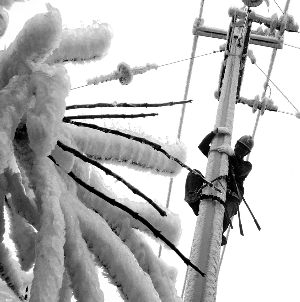 1月7日,广西全州县电力抢修人员艰难爬上覆冰的电线杆抢修输电线路。