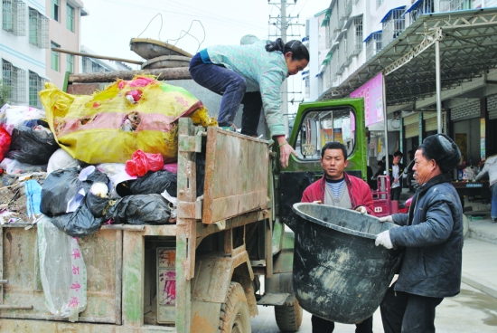 1月5日,青坪镇几名农民清洁工人在街道上装运垃圾。去年以来,永顺县青坪镇着力治理脏、乱、差,通过镇政府、村委会和居民的共同努力,该镇的环境卫生得到了进一步改善。 刘文化 王先平 摄