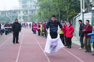 1月9日,龙山县第一小学教职工正在进行趣味运动比赛。该校一负责人介绍,当日,该校组织180名教职工开展别开生面的跑步接力赛,每位选手在100米直道上完成兔子奔、钻地洞、越障碍、跳绳4个趣味运动比赛项目。 秦庆光 摄