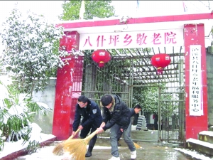 1月19日上午,泸溪县八什坪乡政府党员干部在党委书记向义庭的带领下,冒着风雪,给该乡敬老院的孤寡老人“送温暖”。图为大家在清扫敬老院内的积雪,给老人们清扫出了一方温暖、洁净的天地。
