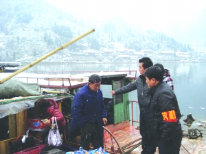 ▲1月19日,春运第一天,保靖碗米坡镇出动巡逻船1艘,安排安监人员5名,在拔茅码头设立安全检查点,对来往船舶开展安全检查,发放安全生产宣传单。图为该镇安监人员对从事水上运输的船只进行安全检查。 彭书凤 彭天忠 摄