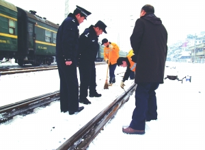 近日持续降雪,造成大部分列车晚点。为了确保铁路线路的安全畅通,1月20日,吉首火车站派出所民警对线路上相关设备进行检查。 赵昌富 摄