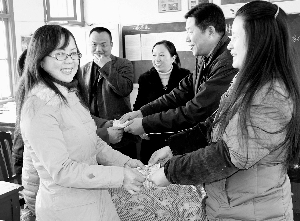 春节前,花垣团结中学杨春红、石国斌、龙琴花和阳广耀4位老师,每人从县教育局领导手中接过500元的慰问金。新春佳节来临之际,花垣县先后对20名特困教职工,每人送去慰问金5000元,100名困难教职工,每人送去500元,还为90多名困难教职工送去互助互济费,共计5万多元。 龙恩泽 摄