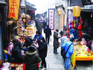 春节期间,很多人选择在外旅游这一时尚的方式过春节。相比在家里,不仅可以游览到秀丽的山川风光,还可以尽情享受浓郁的少数民族春节习俗带来的乐趣。图为2月9日,广东游客在永顺县芙蓉镇古街道景区游玩。