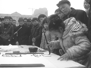 2月3日至7日,花垣县少年儿童积极参加该县春节文化活动,在该县边城公园进行书法作品展览和现场书法技艺展示。图为一女童在展示毛笔书法。 张耀成 摄