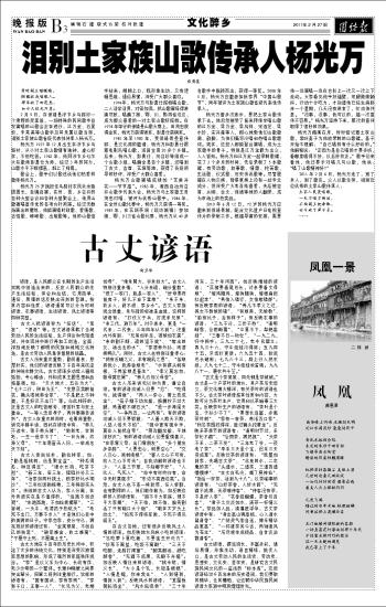 向卫华 谚语,是人民群众在长期的生产生活实践中创造出来的,反应人民群众的生产生活经验、体会和总结,它用简单、通俗、易懂的话反映出深刻的哲理。按其内容和性质,谚语通常可以分为时政谚语、农事谚语、生活谚语、风土谚语等四种类型。 古丈人把谚语称为“俗话”、“常言”、“俚语”等。古丈谚语承载了当地劳动人民的生活经验、生产体会和先祖遗训,并在流传中进行再加工创造,全面、深刻地反映了鲜明的民族和地域文化特色,是古丈劳动人民集体智慧的结晶。 古丈人历来重农重教,勤劳善良,憨厚朴实,他们的谚语反映了千百年来沉淀的传统农耕文化。古丈谚语多劝世人循规蹈矩,专心耕读,并构成其主题思想和品格基调。如:“天大地大,五谷为大”、“七十二行,种田为王”、“生意买卖眼前花,锄头落地养全家”、“不是肥土不种姜,不是好汉不出门”等。与此相符的,正是古丈人的吃苦耐劳、艰苦朴素与安土重命。“一等人忠臣孝子,两件事耕田读书”,古丈人在重农的同时,也尊师重教,讲究半耕半读,因此在谚语中有:“养儿不读书,等于养头猪”、“做到老,学到老,一生一世学不了”、“一日为师,终身父母”、“十年寒窗无人问,一举成名天下知”。 古丈人崇尚俭朴,勤俭持家,如:“勤是摇钱树,俭是聚宝盆”、“种瓜得瓜,种豆得豆”、“细水长流,吃穿不愁”、“新三年,旧三年,缝缝补补又三年”、“治家如同针挑土,败家好比水淘沙”、“三年烂饭砌栋楼,三年稀饭买头牛”。传统的古丈人认为,家人分离,在外奔波实在是不值得的,“远跑不如近爬”、“东跑西跑,不如捡粪搙草”、“三亩地,一头牛,老婆孩子热炕头”、“老死不出门,万事不求人”才是他们心目中的美满的日子。守家恋家,安分守己,满足现状的谚语还有:“金窝银窝,不如自己的狗窝”、“破家难舍,故土难离”、“宁愿守土死,不愿离土生”。 古丈大地在千百年的历史长河中,积淀了太多的传统文化,特别是深受汉族儒家思想的影响,形成了强烈的家庭秩序观念。“家”是以父系为中心、长幼有序、老少分明的一个整体。长辈和晚辈之间要突出辈分,同辈之间则注重排行。这样的谚语有:“国有国法,家有家规”、“家有千口,主事一人”、“长兄为父,老嫂如母”、“娘亲舅大,爷亲叔大”。古丈人特别注重亲情:“人分亲疏,碗分重数”、“进了一家门,就是一家人”、“好母要疼前房子,好儿不弃下堂娘”、“亲不亲、故乡人,甜不甜、家乡水”。古丈人家族观念很重,亲与疏的标准是血缘,这样的谚语有:“打仗父子兵,打虎亲兄弟”、“亲三代,族万年”。对于表亲,更是“一代亲,二代表,三年四年认不到”;注重内外有别:“兄弟如手足,婆娘如衣裳”、“亲的割不断,疏的逗不拢”、“嫁出的女,泼出去的水”、“家婆养外孙,鸡婆抱鸭儿”;同时,古丈人也特别注重孝心:“鸦有反哺之义,羊有跪乳之恩”、“爹娘养我小,我养爹娘老”、“水有源头树有根,不养爹娘是畜生”、“孝父莫忘叔,敬母莫忘舅”、“养儿方知父母苦”。 古丈人历来讲究以和为贵,谦让自敛。有的谚语劝诫人们要“忍”:“吃得亏,拢得堆”、“两人一条心,黄土变成金”、“筷子拗不动龙船,胳膊拧不过大腿,鸡蛋碰不破石头”、“退一步海阔天空”、“一争两丑,一让两有”;有的谚语劝诫人们不要骄傲:“人善人欺天不欺,人恶人怕天不怕”、“强中更有强中手,莫在人前把自夸”、“阴沟翻龙船,平地滚好汉”;有的谚语劝诫人们要重情善义:“在家靠父母,出门靠朋友”、“多个朋友多条路”、“人要忠心,树要空心”、“交人交心,浇树浇根”、“害人之心不可有,防人之心不可无”;自我劝解的谚语也不少:“人是三节草,不知哪节好”、“人比人,气死人”、“命中有时终归有,命中无时莫强求”、“东边不亮西边亮”。当然,古丈人也不是一味软弱,任人宰割,也有剽悍的人,他们敢作敢为,如反映这样的人的谚语有:“路不平大家踩,理不平大家摆”、“天不怕,地不怕,脑壳割丢了只有碗口大个疤”、“敢在太岁头上动土”、“怕死不得将军做,不死不得见阎王”。 在古丈各地,还有很多反映风土人情的谚语。如反映地方风味小吃的谚语:“冬吃萝卜夏吃姜、不要医生开处方”、“炒菜不离盐,吃饭不离酸”、“三天不吃酸,走路打闹窜”、“酸菜酸汤,越吃越香”、“无酒不成席,无酸不开餐”;如反映人情往来的谚语:“钱米短,情义长”、“大小是个礼,长短是根棍”、“人情是锯,你来我去”、“人到情到,情到人到”;反映风水的谚语:“堂屋板凳轮流坐”、“风水轮流转”、“三十年河东,三十年河西”;如反映姻缘的谚语:“买猪要看尾巴长,讨亲要看丈母娘”、“嫁鸡随鸡,嫁狗随狗,嫁根扁担扛起走”、“男怕入错行,女怕嫁错郎”;有反映家教的谚语:“养儿不孝父之过,养女不教娘的错”、“有娘养,无娘教”、“前有比子,后有样子”;有反映农事的谚语:“三九不冷,三伏不热”、“清明断雪,谷雨断霜”、“立夏不下,犁耙高挂”、“三春不日一秋忙”、“一九二九,怀中抱手;三九二十七,老牛巴壁立;四九三十六,守牛娃娃冷得哭;五九四十五,牙齿打更鼓;六九五十四,软泥巴长硬刺;七九六十三,路上行人把衣担;八九七十二,守牛娃娃吹笛调;九九八十一,蓑衣共斗笠。” “古丈是个茶窝窝、四处