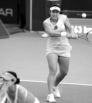 2月25日,中华台北选手詹咏然(右)在比赛中回球。当日,在卡塔尔首都多哈进行的2011年卡塔尔女子网球公开赛双打半决赛中,海峡组合郑洁/詹咏然以1比2不敌胡贝尔(美国)/佩特洛娃(俄罗斯),无缘决赛。