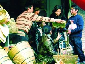 湘西手工竹编具有“精致、小巧、细腻”的特点,属于湖南省非物质文化遗产保护项目。永顺县民族民间工艺大师胡廷贤、徐克双等人利用丰富的“湘西毛竹”资源手工编织了大量地背篓、茶杯等生活器具和缩微手工艺品。他们在芙蓉镇古街道上现场编织竹器销售,引来众多游客的观看、拍照。许多购买竹器的游客认为这些竹器很有民族特色,向外界展示了独特的民族文化。图为3月2日,胡廷贤(左一)正向游客介绍竹编工艺品的特点。 罗 艺 摄