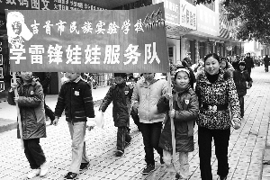 3月4日,吉首市民族实验学校学生响应吉首市团市委的号召,自发组织了一支“学雷锋娃娃服务队”。他们走上街头,开展了宣讲雷锋故事、捡拾垃圾、擦洗公共设施、扶老人过马路等一系列活动,用实际行动掀起了轰轰烈烈的学雷锋热潮。 杨 伟 摄