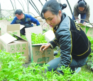 3月11日,永顺县吊井乡吊井村蔬菜育苗基地,菜农张权在请人拣装西红柿幼苗入箱,准备以每根0.70元的批发价卖给张家界菜农。