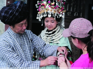 当地百姓也因此受益。以前5块钱一顶的苗族帽子,卖到了60多元,几十元一套的苗服卖到了300元,工人日薪从15块钱提高到80元,收入明显提高。许多苗族能工巧匠的才艺也得到充分施展和丰厚的回报。国家级苗族银饰传承大师龙米谷,就从当初的贫困户一跃而成拥有80多万元家产的富裕户。