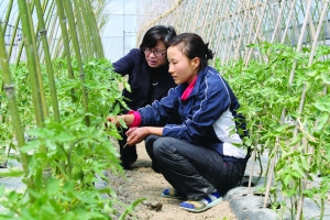彭梅(右),今年29岁,2007年大学毕业,曾先后去过广东、上海等地打工。2010年,她放弃了自己在上海一家上市公司的高薪职位来到泸溪县武溪镇五里洲村,租下了50多个蔬菜大棚种植蔬菜,年纯收入达到5万多元。目前,彭梅的无公害蔬菜已发展到20多亩,56个大棚,有西红柿、辣椒、茄子等10多个品种。图为彭梅与县蔬菜办的专业技术人员一起查看西红柿的长势情况。