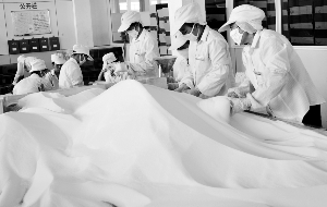 国家食盐定点生产企业山东菜央子盐场精制食盐厂生产车间一角。
